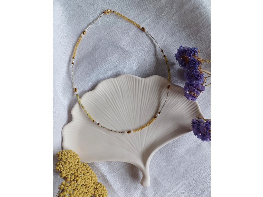 Náhrdelník z minerálů a českých skleněných korálků. Žlutý jaspis je kámen šťastných snů, energie a empatie. Říční perly jsou symbolem čistoty, elegance a moudrosti. Představují ženskou energii a harmonii.